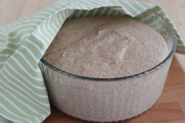 In das warme Wasser wird das Backnatur Ferment gut verrührt. Danach wird in es mit dem abgewogenen Mehl in einer Backschüssel ungefähr 2 Minuten lang gut vermischt. Danach lässt man es luftdicht abgedeckt (Deckel, Folie, Kunststofftüte) für 12-15 Stunden bei 25-27°C zum reifen stehen.