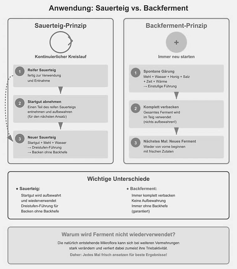 Ganz wesentlich in der Anwendung ist, dass Sauerteige immer nach dem Prinzip – Abnehmen des Startgutes vom reifen Sauerteig für die nächste Sauerteigherstellung. Bei Backferment wird mit einer sogenannten spontanen Gärung gearbeitet.
